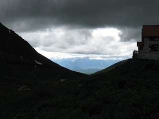 In the afternoon we took a drive up the Hatcher Pass to see the old mine site. It was clouding over and a cool breeze was starting to blow. Looking down the Pass towards the valley that Wasilla and Palmer are in with the range of mountains that have the Kink Glacier. On the right is the old mine managers house that today is the information centre. The mine was in operation until the early 1960ies.